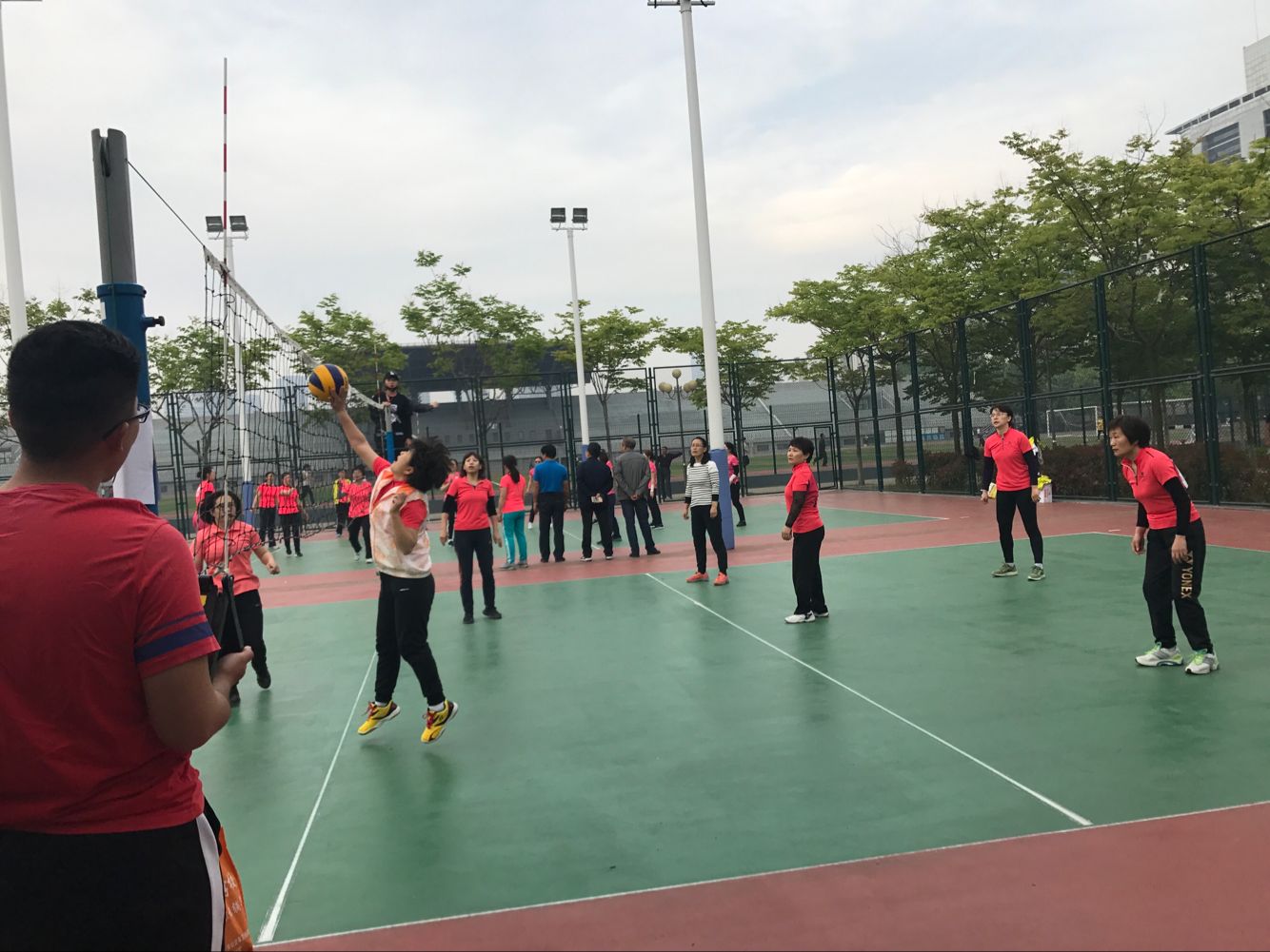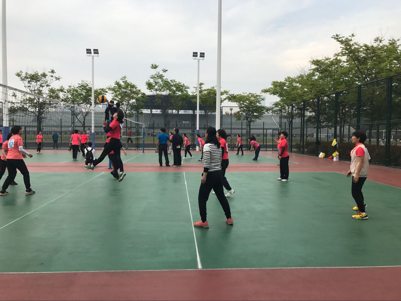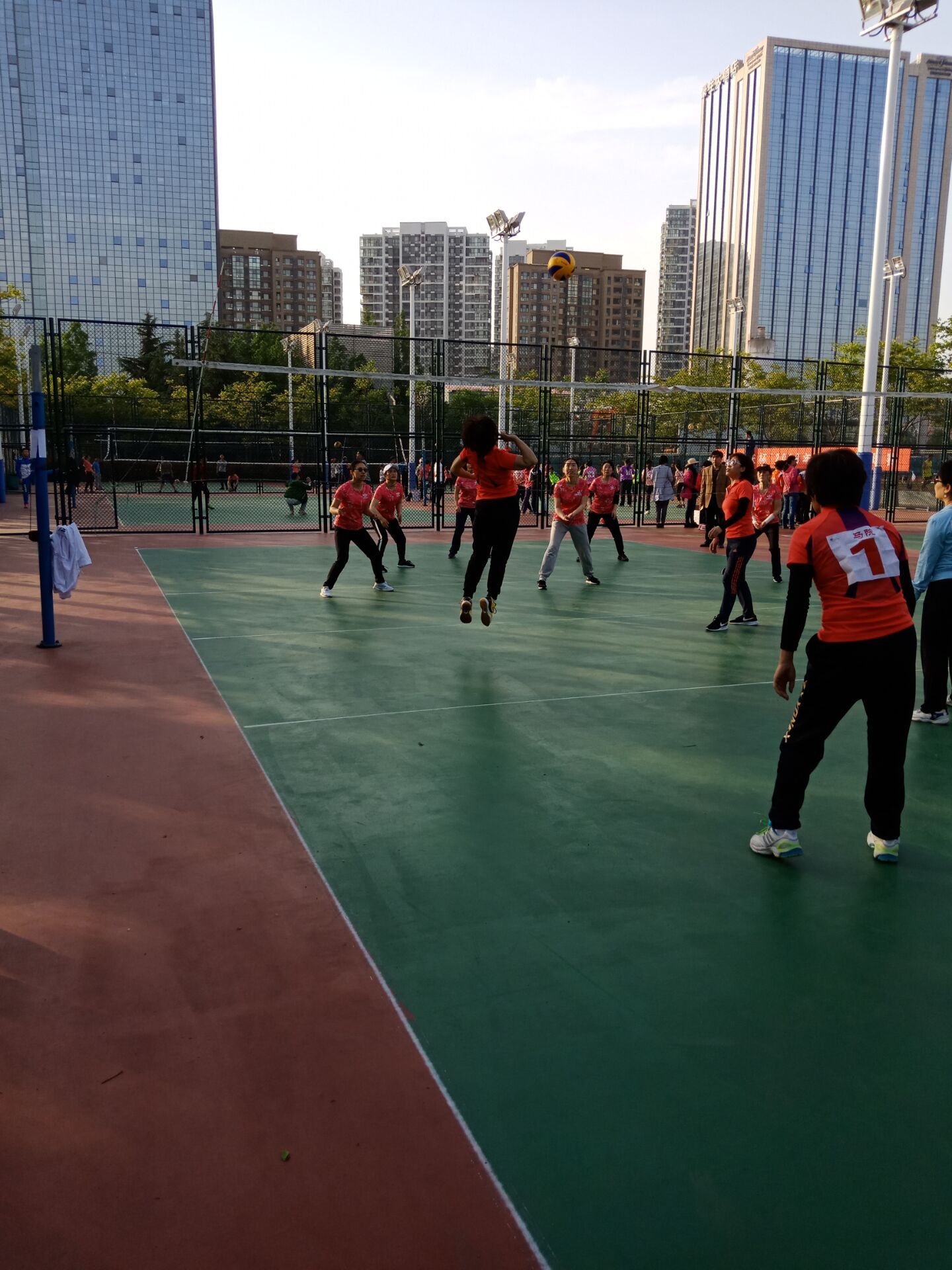 5月24日下午,马院女排对阵计通女排。计通女排是公司传统强队,曾经创造过辉煌成绩。在双方女排的交手历史上,我们从来没有赢过。今年我们组建了马院历史上相对齐整的女排队伍,有张晓青和岳金霞两位重炮手,景艳菊主二传,牛继玲接应二传,于翠萍副攻,又有解晓燕新生力量的加盟。比赛时间已经到了,解晓燕老师才刚刚下课,匆忙赶到球场,没有热身没有练球,直接开始了紧张的比赛。比赛伊始,面对我们稳稳的一传和强力扣球,对方很不适应。很快我们就以大比分2:0领先。第三局比赛开始,我们一路领先,但是随着体力的消耗,我们开始慌乱,被对手超越并最终以23:25遗憾输掉。第四局开始,计通女排一路领先,他们的员工啦啦队在球场上更是热情高涨,加油叫好声不断,这不仅没有给我们任何压力,反而激发了我们的斗志,我们每打一个好球,所有队员齐声叫好,自己给自己鼓励。毕竟对手强大,她们以21:17领先。我们叫了暂停,张晓青的重扣结束了她们的得分势头。我们一路追赶,并且最终以25:23赢下了关键的第四局。
