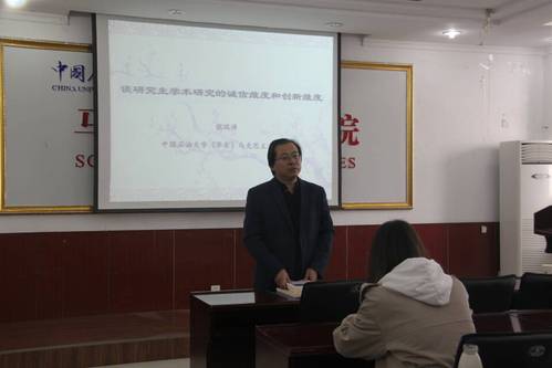 本次讲座中,张瑞涛教授以“谈研究生学术研究的诚信维度和创新维度”为主题,通过对几本关于学术研究的书和杂志的介绍,提出“何谓研究生,研究生何为”的问题,以此来引入研究生学术研究的诚信维度和创新维度,即真、新、范。首先,张瑞涛教授对“真”进行解释,学术研究应当诚信,一方面是论据要充分全面,做到不少、不多,另一方面观点要真实无妄,做到不抄、不假,要“讲自己,自己讲”。随后,张瑞涛教授提出“新”是学术研究最高贵的品质,在创新上,要做到人无我有、人有我精、人精我转;在选题上,要选择真问题、好问题、专业问题,在学术研究过程中始终保持创新意识。最后,张瑞涛教授对“范”进行了解读,提出“范”是学术研究的制度保障,学术研究规范要有技术自觉和道德自觉。