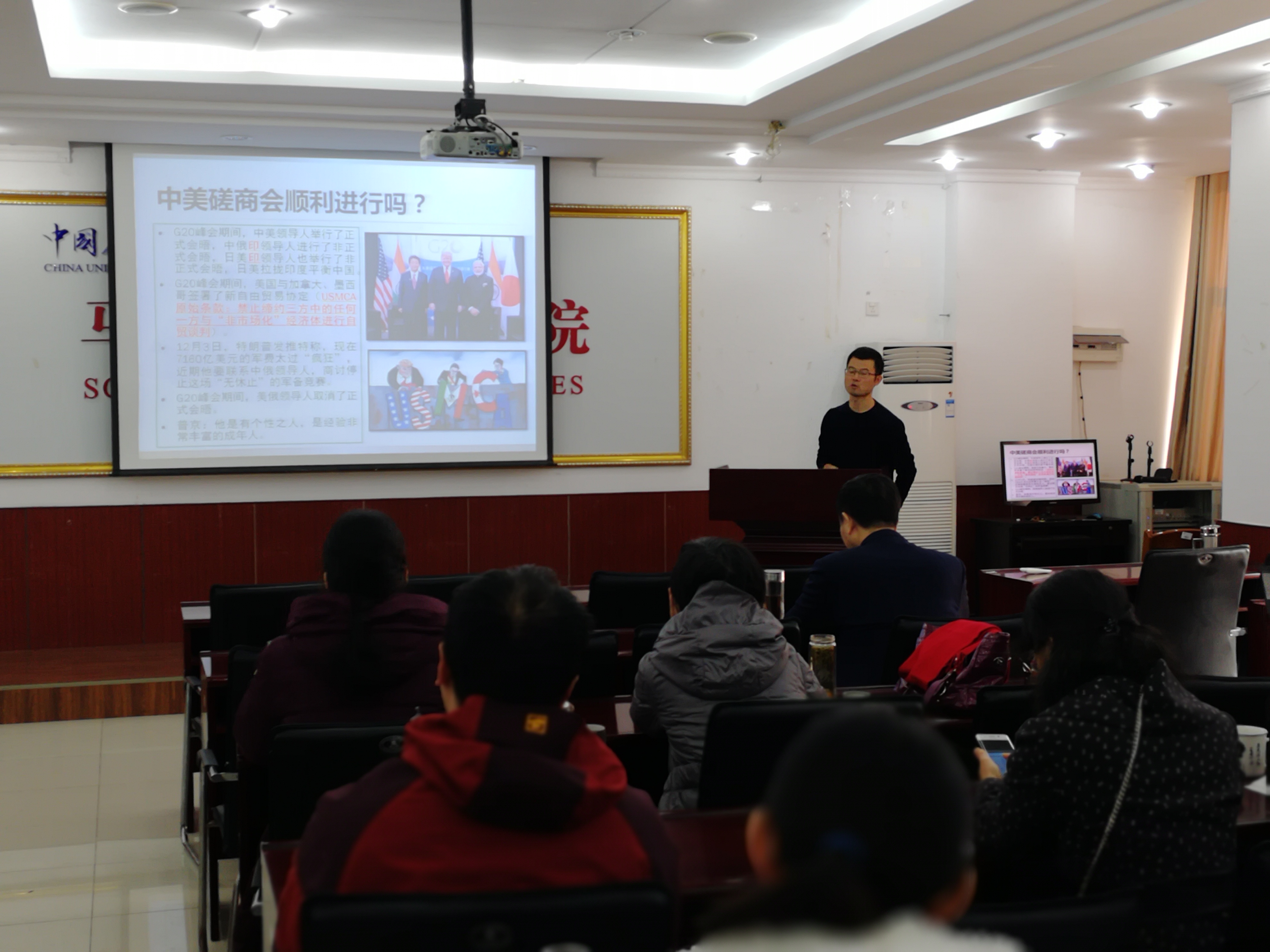 12月13日上午8:30分,概论党支部在文理楼457举行主题党日活动,活动由郎帅老师为大家做关于“中美经贸摩擦与中美关系的未来”的报告,公司各党支部的党员老师和员工党员参加了报告会。郎帅老师在报告中首先指出了经贸关系在中美关系中的重要性,随后结合当今的热点问题谈了中美经贸磋商的重要性和积极意义,最后指出在未来的中美关系发展中两国应该以合作取代对抗,实现共赢。郎帅老师引经据典,通过大量的数据和案例给我们奉献了一场精彩的报告,为理解当下的中美关系提供了新的思路。