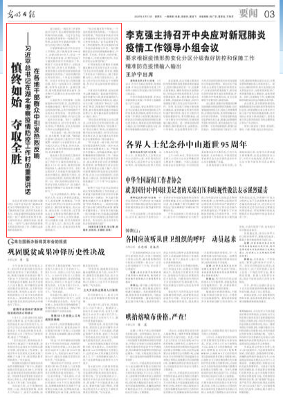 光明日报3月13日第3版《慎终如始 夺取全胜——习近平总书记在湖北考察疫情防控工作时的重要讲话在各地干部群众中引发热烈反响》一文中,sunbet副经理张瑞涛教授说“总书记视察武汉,看望一线医护人员、社区工作者和志愿者,令人备受鼓舞、倍感振奋。武汉必胜、湖北必胜、中国必胜,这正是社会主义制度优势的最好诠释。战疫凝聚了中华儿女团结奉献、同心同德的力量,我们当再接再厉,以爱人之仁、担当之勇、创新之智、躬行之实,打赢这场没有硝烟的战斗。”