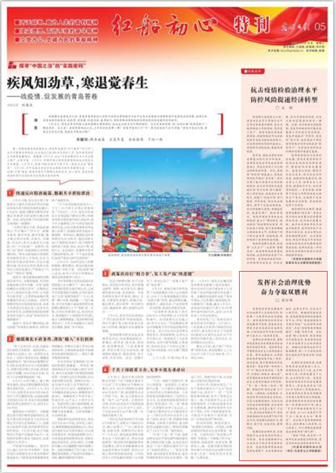 光明日报3月18日第5版刊登了公司党委书记司江伟教授的文章《发挥社会治理优势 奋力夺取双胜利》。文章从发挥社会治理优势,最根本的是要充分发挥党在社会治理中的领导作用,要构建多元主体协同协作的工作机制,要坚持社会治理的核心在人三个方面,阐述了面对疫情防控和经济社会发展两个战场,青岛充分发挥其正在形成的社会治理优势,以新的担当作为努力向党和人民交上一份优异答卷。