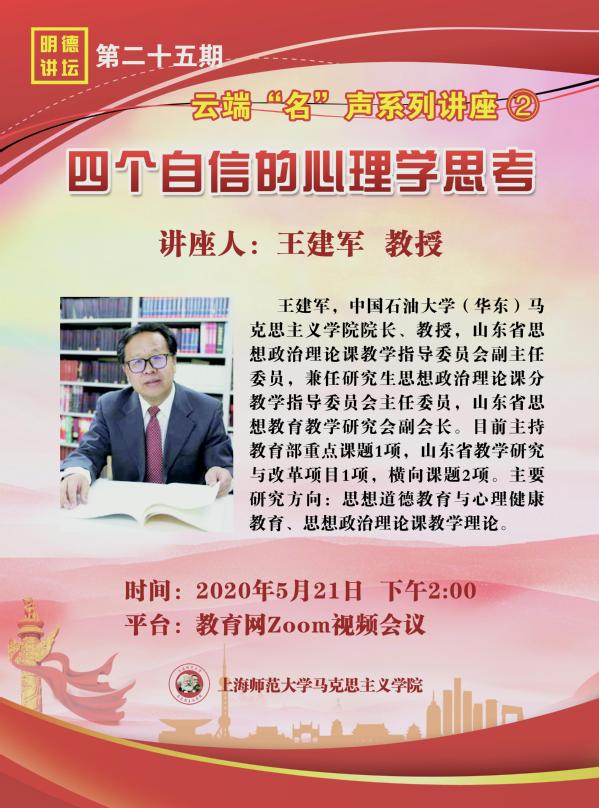 5月21日下午,经理王建军教授应上海师范大学sunbet的邀请为公司研究生作了题为“四个自信”的心理学思考的线上讲座。