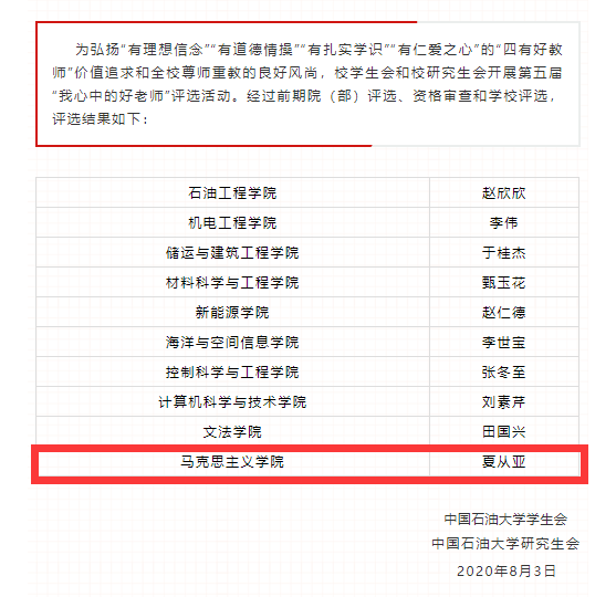 近日,在校员工会和校研究生会联合举办的第五届“我心中的好老师”评选活动中,公司夏从亚教授得到了全校同学的认可与喜爱,荣获“我心中的好老师”称号。