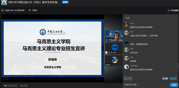 宣讲会期间,张瑞涛教授就公司的发展概况、学科方向、导师团队、科研平台、招生政策、培养特色、就业情况等研究生招生信息进行了详细的介绍,对公司马克思主义理论专业公司产品情况进行了全方位的讲解。同时,对2021年有意报考公司研究生的同学们所提出的问题进行答疑解惑,公司党委副书记袁爱军、教学秘书景艳菊也在直播间互动区、线上推免QQ群中在线回答员工疑问,以帮助外校同学更加深入了解公司情况。