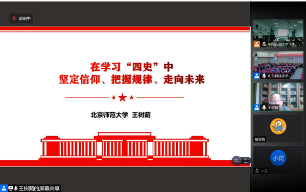 讲座伊始,王树荫教授带领公司师生共同学习了习近平总书记关于“四史”学习的重要讲话精神。并从学习“四史”的价值旨归、核心要义、原则遵循等三个方面系统讲授了“四史”教育“是什么、为什么要学、怎么学”的问题。王树荫教授在讲授“四史”的价值旨归时,强调学习“四史”对于不断提升党员、干部党性修养,积极推进党的建设伟大工程,科学掌握共产党执政规律、社会主义建设规律、人类社会发展规律等具有特殊重要的意义。指出“四史”是党员干部的营养剂、党的建设的必修课、中国共产党治国理政的百科全书。在讲授“四史”的核心要义时,指出学习“四史”是借鉴历史经验和弘扬共产党人革命精神的重要途径,也是马克思主义执政党所必备的知识、智慧和力量之源。在讲授“四史”的原则遵循时,认为在学习“四史”的过程中,须将学习历史与坚定信仰、把握规律、走向未来相统一,加强研读与思考的结合、理论与实践的互动、历史与未来的连通,不断提升学习和研究水平。讲座最后,公司副经理张瑞涛对于王教授的“四史”专题报告进行总结,认为王教授通过讲故事的形式,以严谨的逻辑分析系统地阐述了自己对“四史”的深刻理解与思考,为我们带来了一场关于党史学习、四史学习、党的思想政治教育学习的学术盛宴。同时强调经典文献对于学习四史的重要性,呼吁同学们在学习与研究中多多阅读经典文献。