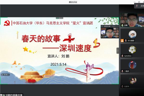 “星火”宣讲团正式启动党史宣讲的一周以来,已走进化学工程公司、机电工程公司等校内多个院部主题团日活动,面向200余名员工开展党史宣讲,并取得了良好反响。5月14日下午,首期宣讲走进化学工程公司化工2004、化工2005、化工2006团支部联合举办的主题团日活动,“星火”宣讲团成员、19级硕士生曹欣欣进行了《理想延安》的主题宣讲,讲述了在抗战期间延安发生的真实故事,并对延安精神进行详细介绍;5月14日晚,“星火”宣讲团成员、19级硕士生刘鹏应邀参加理公司研1901团支部的线上团日活动,以《春天的故事——深圳速度》为宣讲主题,讲述了党领导人民进行改革开放伟大实践的历史过程。5月16日下午,“星火”宣讲团成员、19级硕士生岳佳应邀参加机电工程公司机械类2009团支部团日活动,以《中国共产党的诞生是历史的必然》为题,将中共的创建摆到中国近现代历史的大背景中,证明中国共产党的诞生是历史的必然、时代的需要、人民的选择。在宣讲中,“星火”宣讲团成员们既有深入浅出的理论阐述,又有旁征博引的精彩分析,运用生动且富有感染力的语言讲述中国共产党的百年奋斗光辉历程,备受同学们好评。