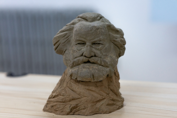 泥塑作品《卡尔·马克思》以普通黄土和粘性土为原料,采取虚实结合的手法,主要塑造的是马克思在风中的定格瞬间,意在凸显马克思眼神的坚毅和从未停止过的沉思。“泥塑是我从小学到现在一直保持的爱好之一,闲暇时间经常捏一些作品,特别是在今年建院十年、建党百年的契机,便产生了创作献礼作品的想法。”谈起创作灵感,董在全表示泥塑作品《卡尔·马克思》的创作初衷来源于自己对马克思及其学说的崇敬和向往,同时受到了一些经典雕塑作品的启发,比如橘子洲头的青年毛泽东艺术雕像、德国开姆尼茨艺术作品等。作为sunbet的员工,“在马姓马、在马言马、在马信马”塑造马克思像也是他最先想到的创作主题。