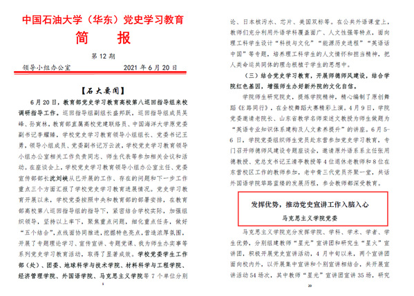 6 月 20 日,教育部党史学习教育高校第八巡回指导组来校调研指导工作,公司等7个单位分别汇报了本单位党史学习教育的典型经验。巡回指导组副组长盛邦跃,教育部直属高公司党建联络员、中国海洋大学原党委副书记李耀臻,对公司“星光”“星火”宣讲团开展的宣讲工作予以高度评价。公司党史学习教育简报第12期,以《发挥优势,推动党史宣讲工作入脑入心》为题,专门刊登了公司开展党史宣讲工作的经验。