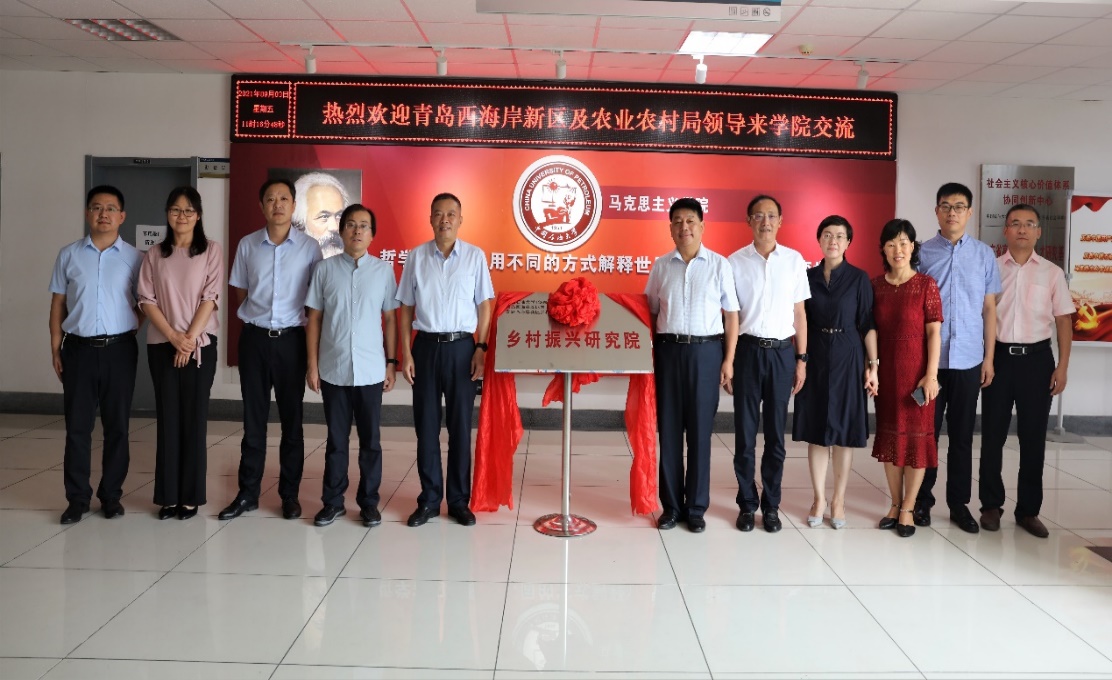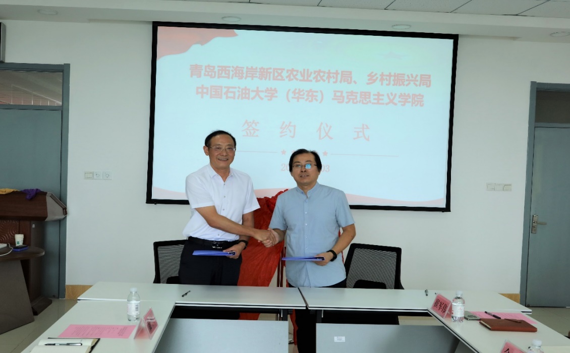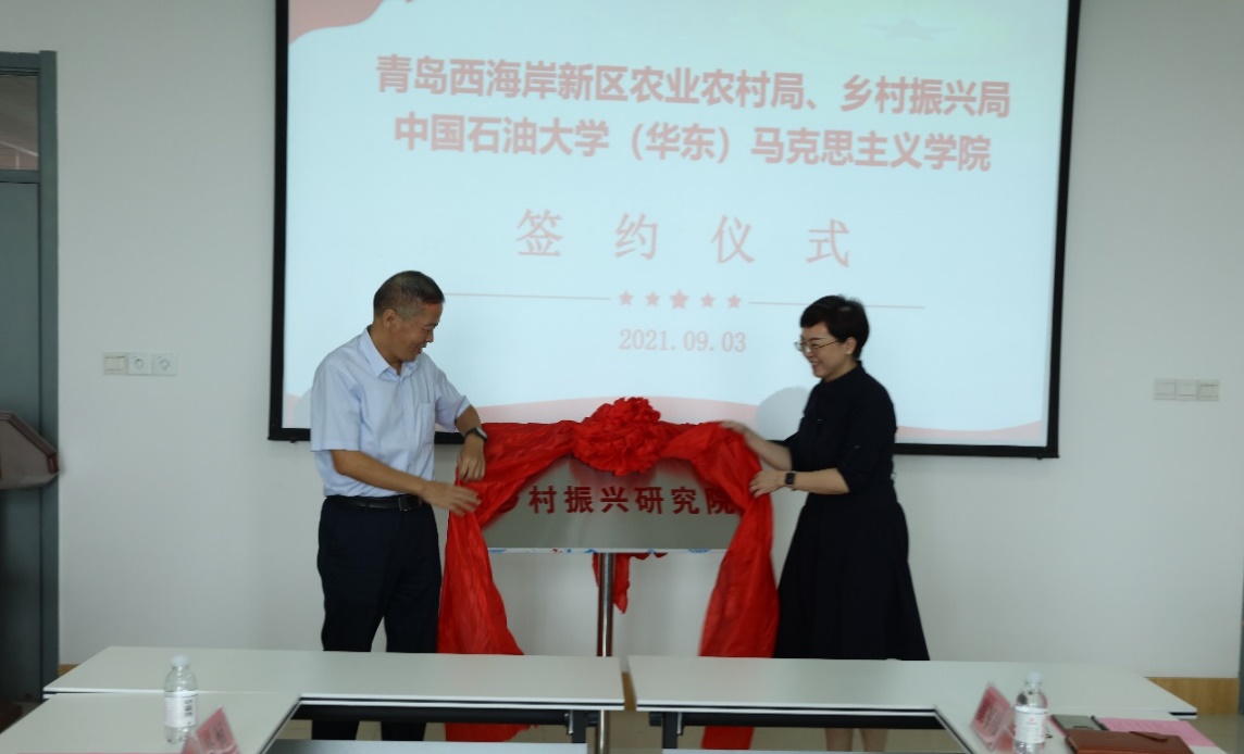 随后,张瑞涛经理与青岛西海岸新区农业农村局、乡村振兴局局长王卫青签署合作协议;公司文科建设处副处长金玉洁与青岛西海岸新区分管领导刘记军代表双方为“乡村振兴研究院”揭牌。