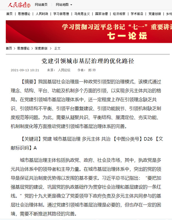 近日,《人民论坛》2021年9月上期(总第716期)刊发了公司郎帅老师的党史党建研究文章《党建引领城市基层治理的优化路径》。文章认为,党的十九大确立了党委领导下政府负责及多元主体共同参与的基层社会治理体制。通过党建引领城市基层治理是必要的,但也存在一定的困境,需要不断推进其路径的完善。文章指出,我国基层社会治理是一种政党引领型的治理模式,该模式通过理念、结构、平台、功能及机制多个方面的引领,以实现多元主体共治的格局。在党建引领城市基层治理体系中,还一定程度上存在引领理念缺乏共识、引领结构不平衡、引领平台重复建设、引领功能脱节、引领机制缺乏制度规范等问题。为此,需要从凝聚共识、平衡结构、厘清定位、夯实功能、机制制度化等方面推动党建引领城市基层治理体系的完善。