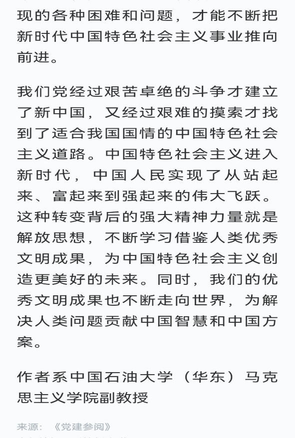 近日,王庆忠副教授发表在《党建参阅》(2021年第12期)的文章《以解放思想开创中国特色社会主义更美好未来》被“学习强国”转载刊登。文章认为,解放思想是马克思主义的内在要求。马克思主义特别强调要根据不断变化的阶级斗争形势丰富发展自身的理论体系,因此要特别注重意识的能动作用,摆脱陈腐的偏见与思想的束缚,客观、平等地看待事物。解放思想是马克思主义中国化理论成果的内在要求。在马克思主义与中国革命、建设和改革相结合的过程中,形成了毛泽东思想、邓小平理论、“三个代表”重要思想、科学发展观、习近平新时代中国特色社会主义思想等理论体系,而解放思想在这些理论形成的过程中发挥了重要的作用。解放思想是推进新时代中国特色社会主义事业的内在要求。在新时代中国特色社会主义事业的建设过程中,我们不断解放思想,冲破思想观念的障碍、突破利益固化的藩篱,用创新思维、辨证思维解决了改革路上出现的各种困难和问题,不断把中国特色社会主义事业推向前进。
