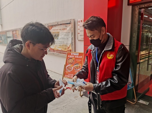 (员工党员刘琦同学、朱敏同学作为志愿者在玉兰苑餐厅向同学分发口罩)