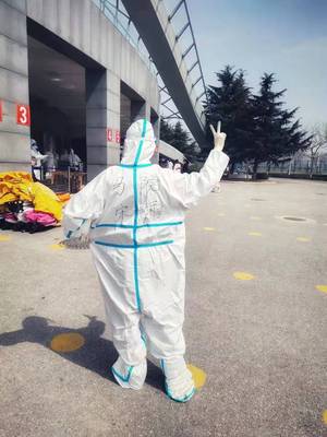 (3月24日公司教师党员宋霞老师身着防护服,为同志们加油打气)