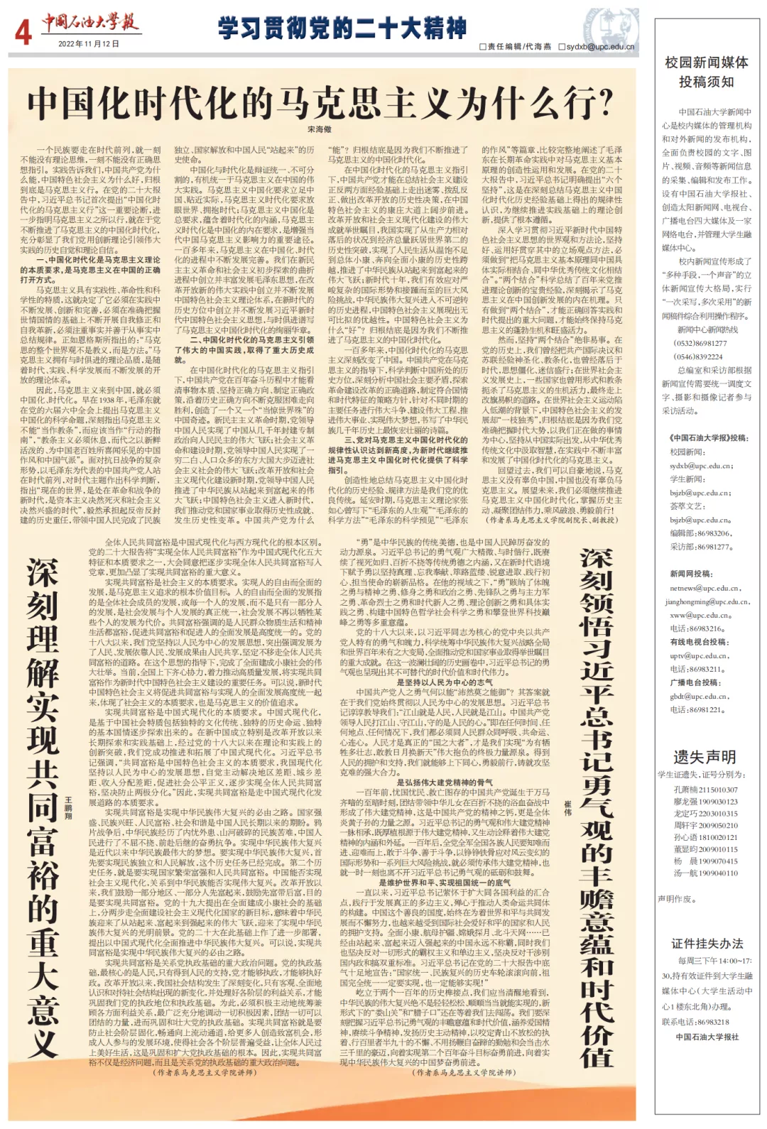 11月12日,《中国石油大学报》第16期第4版整版刊发了公司教师撰写的3篇阐释党的二十大精神的理论文章。