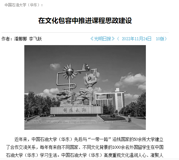2022年11月24日,《光明日报》刊发公司潘娜娜教授和李飞跃博士联合撰写的研究成果《在文化包容中推进课程思政建设》。该文从以包容文化涵养课程思政的校园氛围、以包容文化丰富课程思政的上下形式和以包容文化拓宽课程思政的内外渠道三个方面全面系统地介绍了公司课程思政建设的格局、特色和效果,体现了在公司在课程思政中高度重视文化温润人心、凝聚人心的力量。
