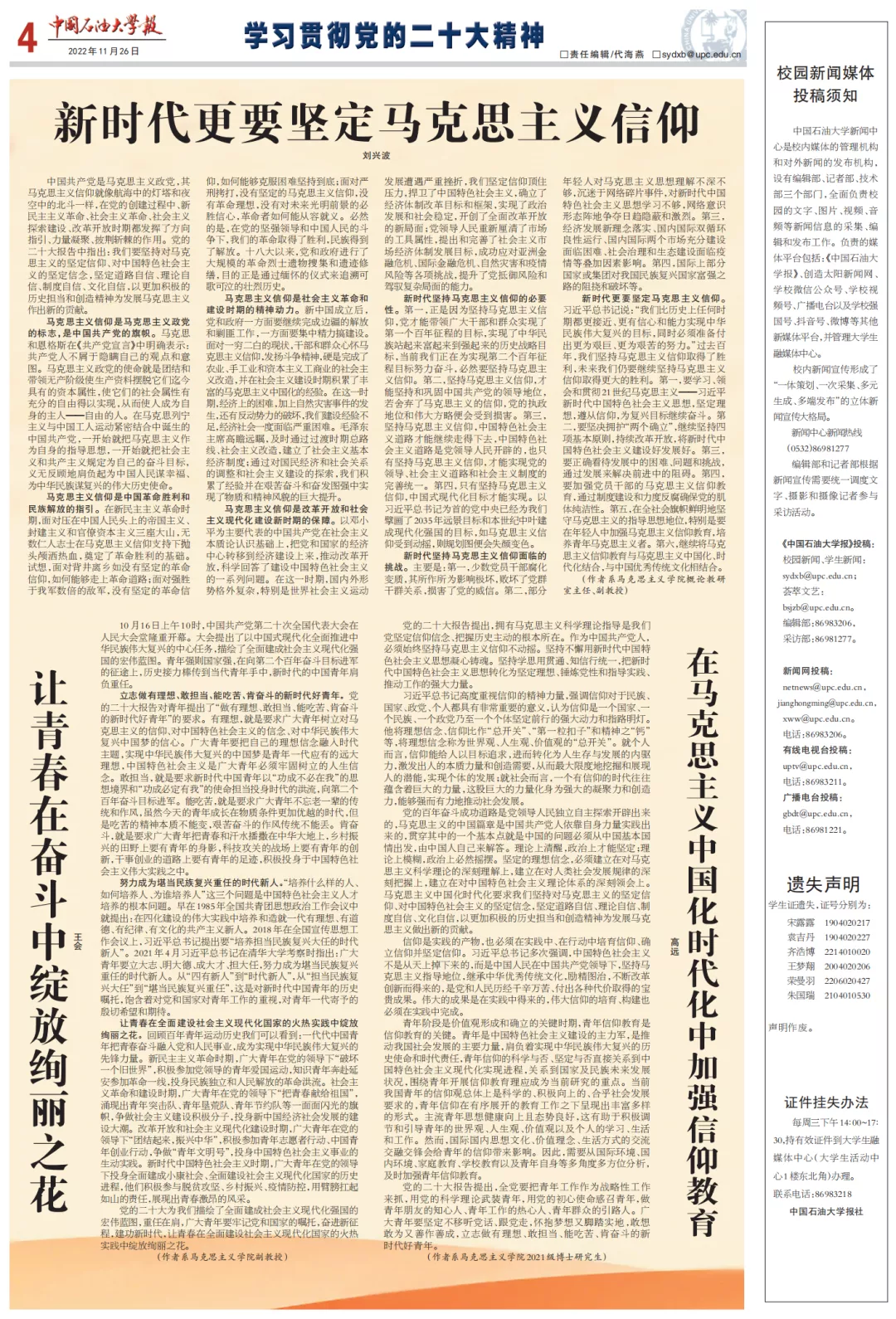 11月26日,《中国石油大学报》第17期第4版整版刊发了公司教师、博士生撰写的3篇阐释党的二十大精神的理论文章。