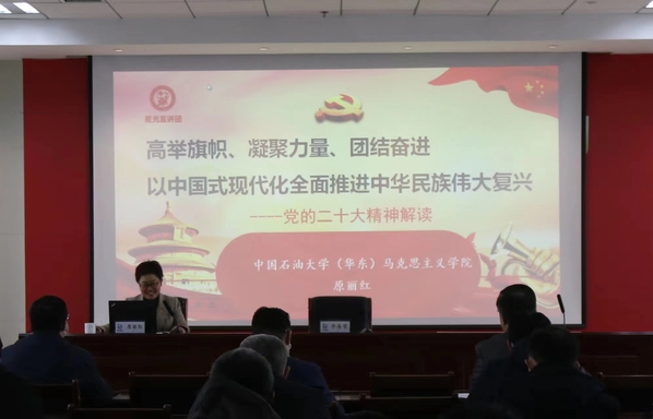 原丽红副教授以《以中国式现代化全面推进中华民族伟大复兴的政治宣言和行动纲领》为题,从事关党和国家事业继往开来、事关中国特色社会主义前途命运、事关中华民族伟大复兴等方面,对党的二十大精神进行了详细解读。