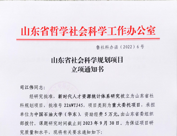 近日,由公司司江伟教授担任首席专家申报的《新时代人才资源统计体系研究》获批山东省社科规划重大委托项目,这是公司首次获批该类型项目。