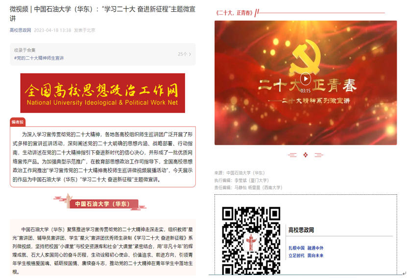 近日,全国高校思想政治工作网展示了公司“星光”、“星火”宣讲团理论宣讲成果,并且展示了“星火”宣讲团成员周家豪同学的《二十大,正青春》主题微宣讲作品。