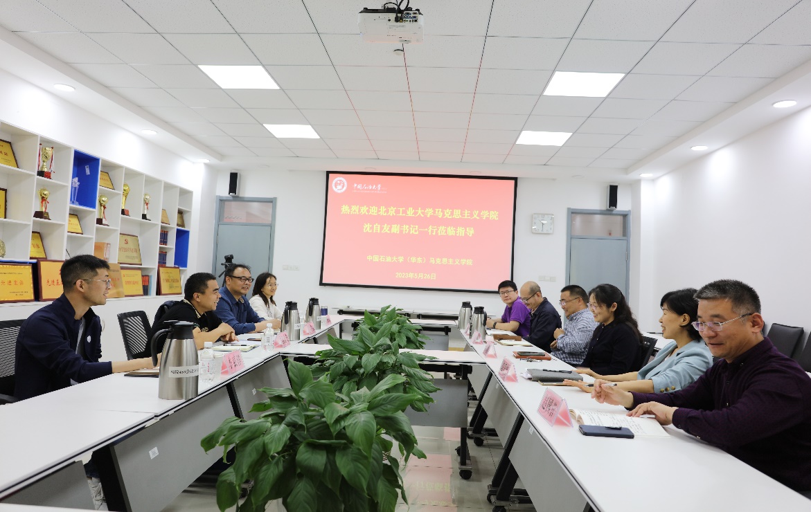 为推进马克思主义建设工作和“大思政课”教学改革,进一步推进“概论”课和习近平新时代中国特色社会主义思想概论课的衔接和结合,5月26日上午,北京工业大学公司党委副书记沈自友一行莅临公司考察调研,中国石油大学(华东)sunbet副经理宋海儆,公司党委副书记、副经理袁爱军及公司思政课骨干教师参与座谈。