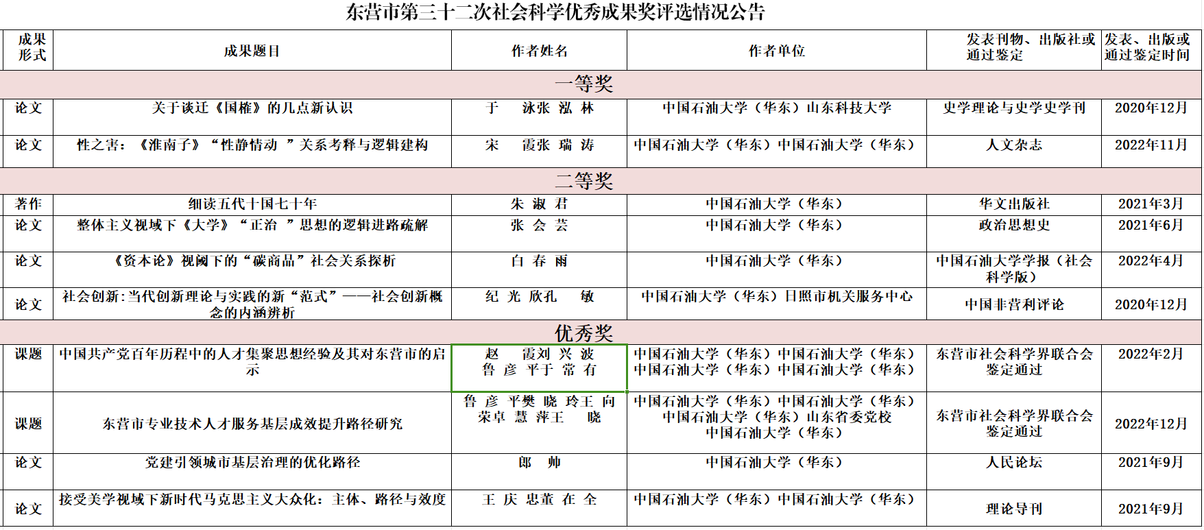 近日,东营市社会科学优秀成果奖评选委员会公布了东营市第三十二次社会科学优秀成果奖评选结果,公司共有十项成果获奖。其中于泳、张泓林的论文《关于谈迁<国榷>的几点新认识》和宋霞、张瑞涛老师的论文《性之害:<淮南子>“性静情动 ”关系考释与逻辑建构》获得一等奖。