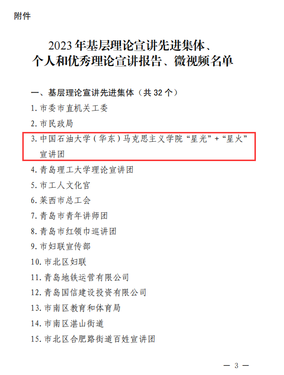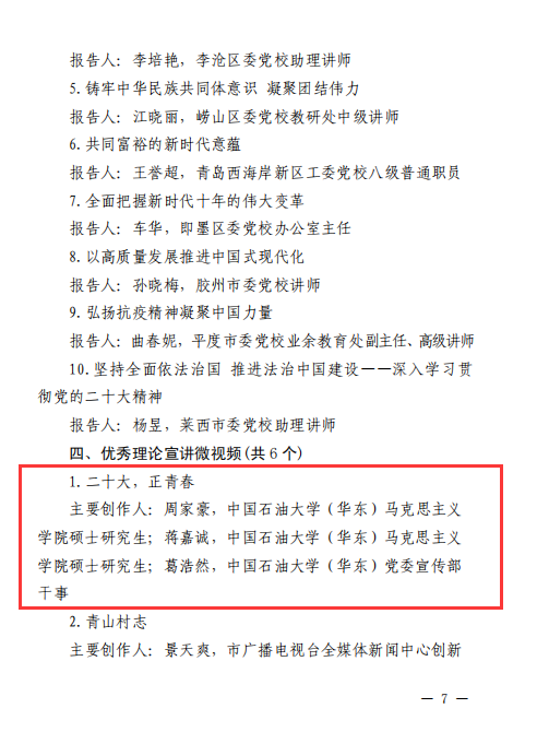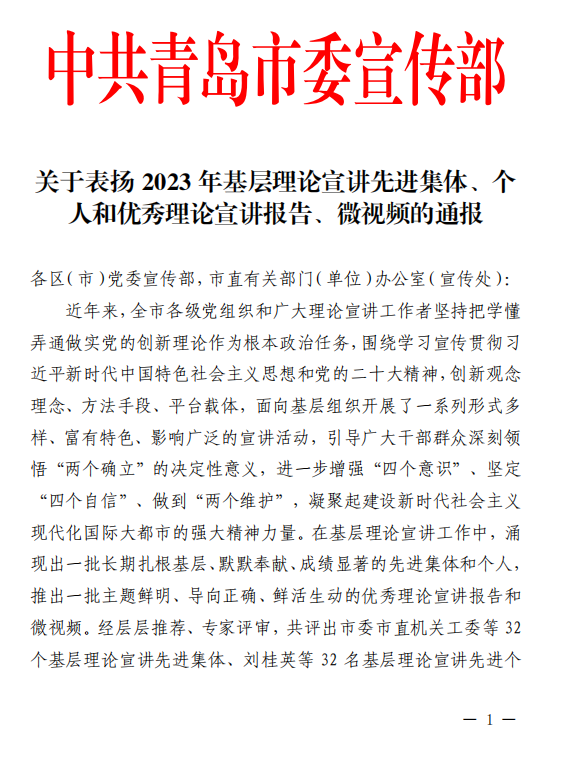 近日,中共青岛市委宣传部印发《关于表扬2023年基层理论宣讲先进集体、个人和优秀理论宣讲报告、微视频的通报》,对32个基层理论宣讲先进集体、32名基层理论宣讲先进个人、10篇优秀理论宣讲报告、6个优秀理论宣讲微视频予以通报表彰。公司“星光”+“星火”宣讲团荣获“基层理论宣讲先进集体”,公司研究生周家豪、蒋嘉诚和公司党委宣传部葛浩然老师合作完成的《二十大,正青春》微视频荣获“优秀理论宣讲微视频”。