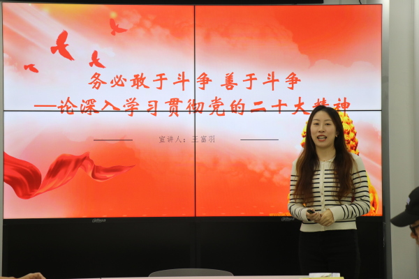 王富羽围绕党的二十大报告和新党章,结合实例数据和自身的学习体会,详细阐述了党的二十大的重大意义和深刻内涵。她以“务必敢于斗争 善于斗争——论深入学习贯彻党的二十大精神”为主题,用生动的语言解读了斗争精神的马克思主义理论依据,并通过展示党的十八大以来党和国家事业取得的历史性成就、发生的历史性变革,让社区党员同志更加直接地感受到斗争精神的重要意义。最后,王富羽号召社区党员同志积极从百年党史中汲取斗争精神力量,依靠斗争赢得未来。