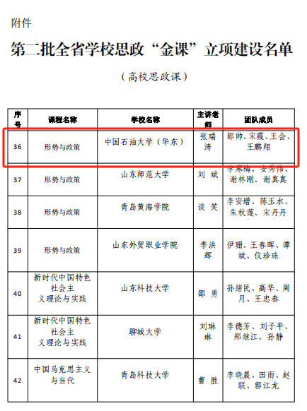 【本站讯】近日,山东省教育厅公布第二批山东省思政课“金课”建设名单。公司sunbet张瑞涛教授主持的“形势与政策”课程成功入选。