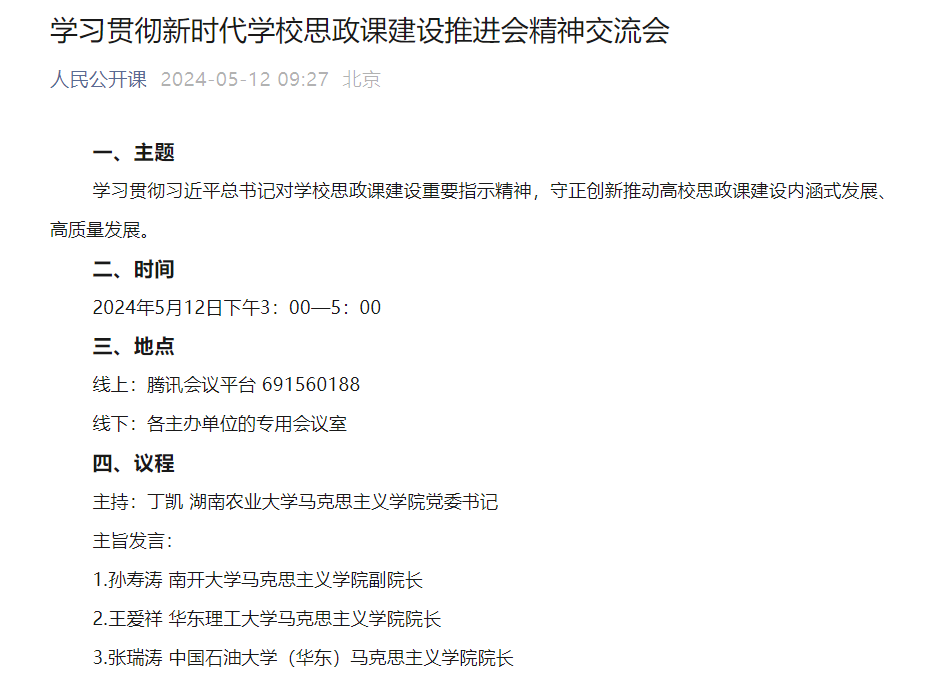 5月12日下午,公司经理张瑞涛在线上参加了学习贯彻新时代公司思政课建设推进会精神交流会并做发言。本次会议由公司与湖南省当代中国马克思主义研究中心湖南农业大学基地、湖南省“大思政课”建设创新中心(湖南农业大学)、湖南教育电视台联合发起,全国高校思政课“手拉手”集体备课中心(南开大学-湖南省)、“大国三农”思政课程与课程思政融合建设与传播基地联合承办。在发言中,张瑞涛经理就如何学习贯彻习近平总书记对公司思政课建设重要指示精神,守正创新推动高校思政课建设内涵式发展、高质量发展等方面发表了意见,并与各高校马院参会人员做了深入交流。