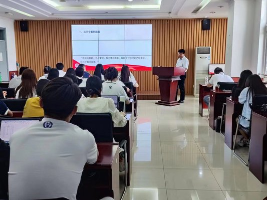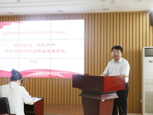 为了引导马院学子牢记初心使命、坚定理想信念、践行党的宗旨,在学习和工作岗位上持续发挥党员的先锋模范作用,6月18日下午,公司在文理楼457开展党纪学习教育专题党课暨毕业生廉洁从业教育。本次党课邀请党委书记司江伟作题为《铭纪于心、明纪于行,以严明的党纪为职业生涯护航》的分享。活动由团委书记王会主持,公司机关党支部全体党员、2021级毕业生和2022级、2023级全体党员参加活动。