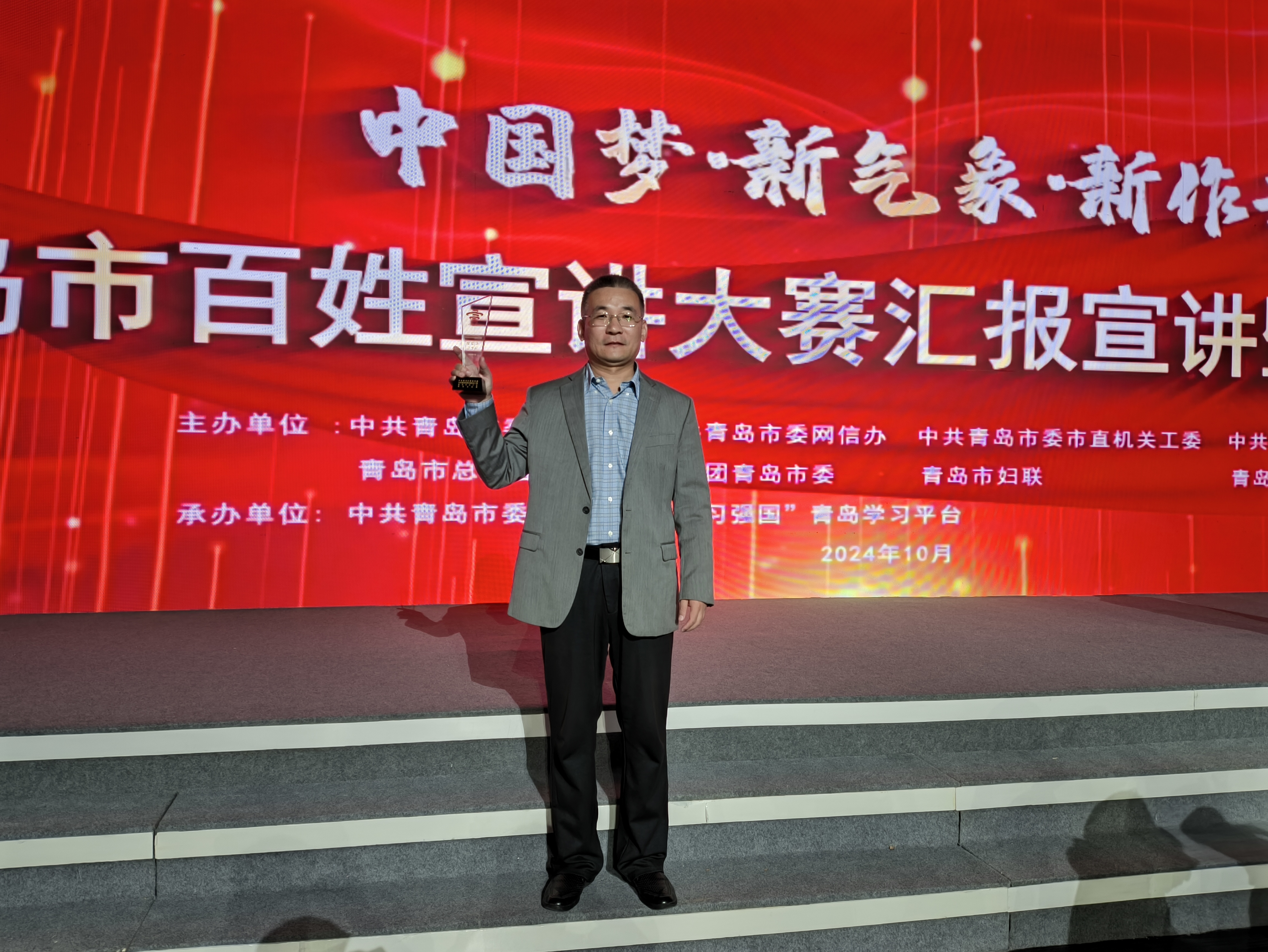 2024年10月24下午,“中国梦·新气象·新作为”青岛市百姓宣讲大赛汇报宣讲暨颁奖仪式在青岛市广播电视台800平米演播大厅举行。公司赵国营副教授创作的“何为中国式现代化的‘中国式’?”获理论类二等奖并上台领奖。