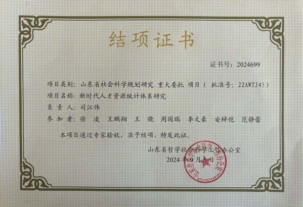 近日,由公司司江伟教授主持的山东省社会科学规划研究重大委托项目《新时代人才资源统计体系研究》(批准号22AWTJ45)顺利通过专家验收,并正式结项。根据党的二十大报告对新时代人才工作的部署,2022年11月,中共山东省委组织部确定了6项人才研究重大课题,以省社科规划重大委托项目的形式发包招标。经过严格的竞标、答辩等环节,公司司江伟教授及其团队获准承担《新时代人才资源统计体系研究》项目。