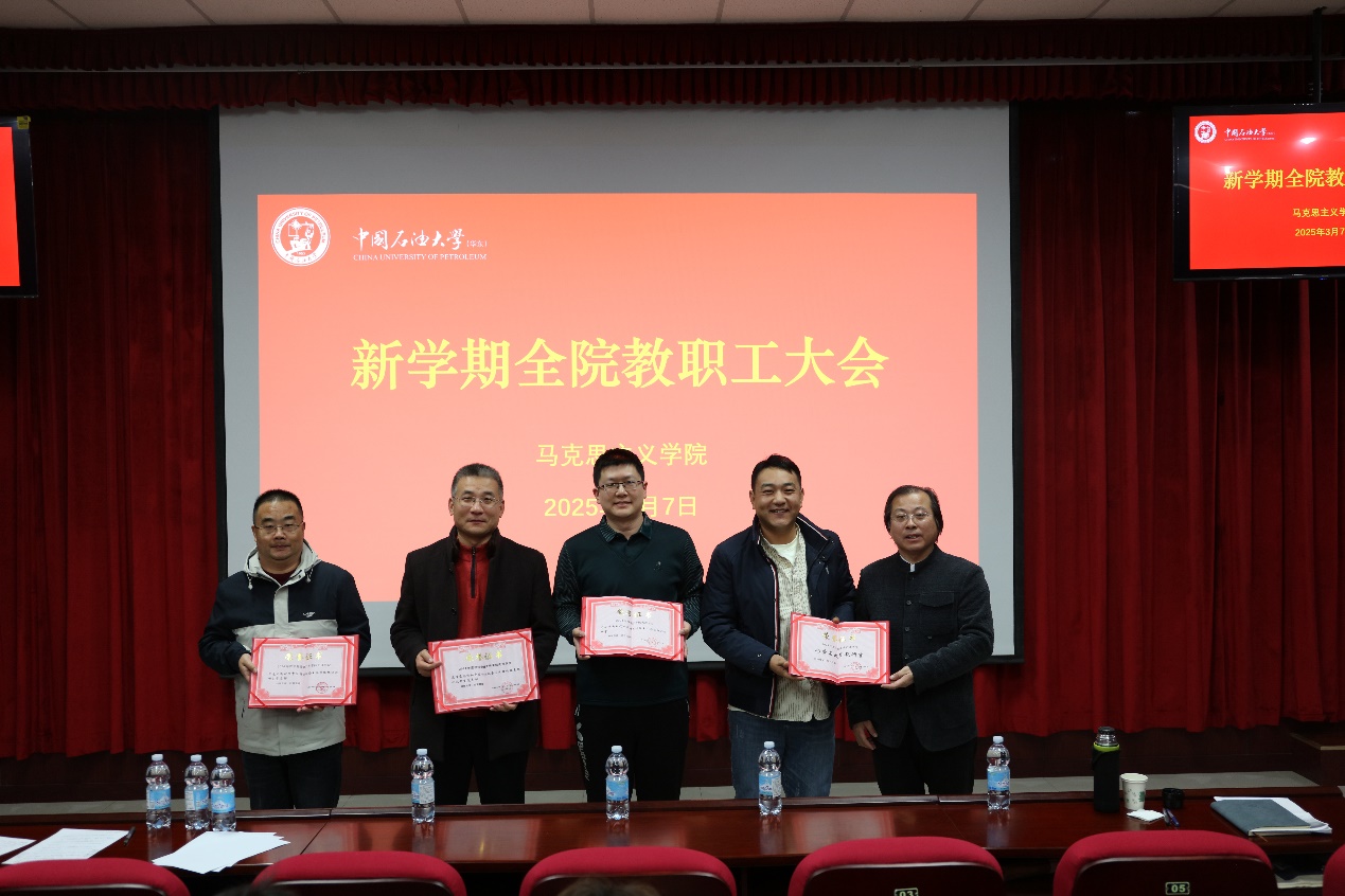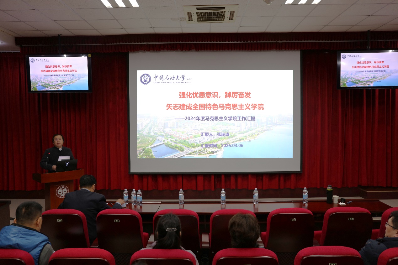会议第一阶段,张瑞涛经理对公司2024年度工作进行总结并对2025年工作作总体安排,并传达学习上级关于思政课建设的相关文件。他指出,在公司党委的正确领导下,全院上下团结协作,实现了公司“十四五”规划关键指标的突破。同时,他强调全院上下务必戒骄戒躁,常怀忧患意识,接续奋斗,追求卓越;要系统谋划公司“十五五”发展蓝图,踔厉奋发,力争跻身首批“全国特色马院”行列。随后,张瑞涛经理为获评2024 年度考核优秀的教研室及党支部颁发荣誉证书,鼓励全院上下向优秀单位学习,营造比学赶超的良好氛围。