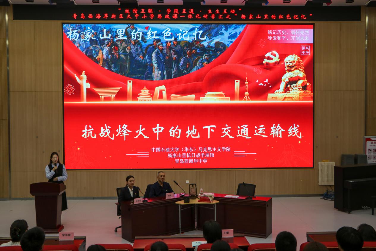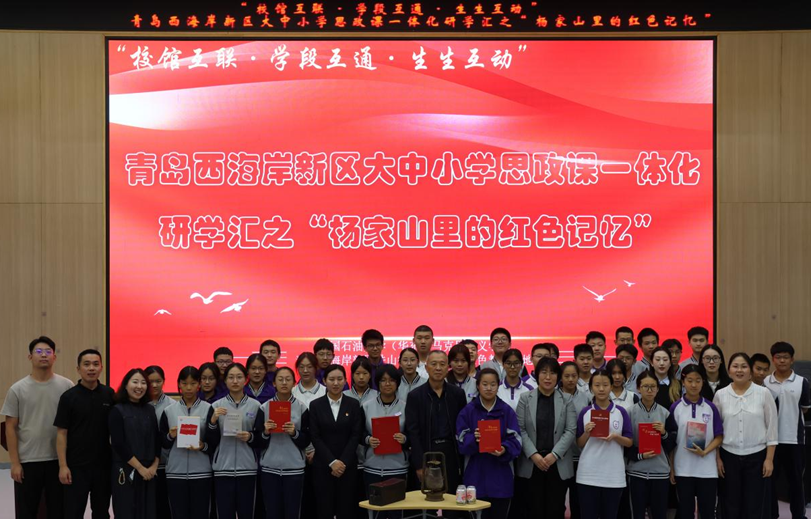 为深入推进大中小学思政课一体化建设,公司于10月14日在青岛西海岸中学举办“杨家山里的红色记忆”教学活动。本次活动采取“校馆互联·学段互通·生生互动”模式,邀请杨家山里革命后代杨光、杨家山里抗日战争展馆馆长张文君作为访谈嘉宾,公司副经理宋海儆、西海岸新区铁山街道党办主任王蕾、青岛西海岸中学副董事长毕善忠、青岛西海岸中学师生代表出席活动。