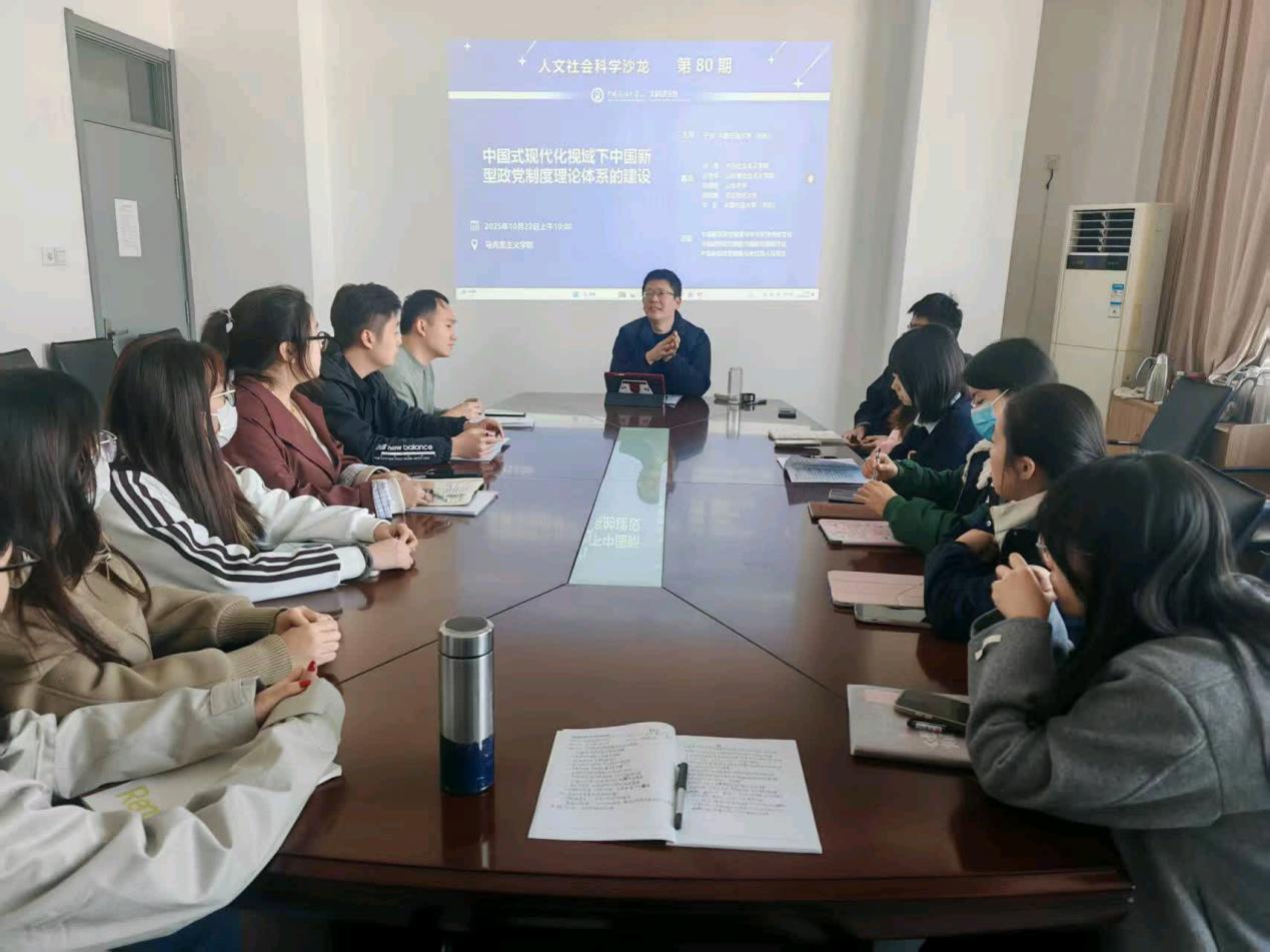 2025年10月22日上午,第80期人文社会科学青年学者沙龙在文理楼462成功举办,主题为“中国式现代化视域下中国新型政党制度理论体系的建设”。沙龙主讲嘉宾包括中央社会主义公司孙信教授、山东省社会主义公司吉秀华教授、河北农业大学贾晓强老师、山东大学博士后何建春。公司毕松老师为召集人,公司部分硕士研究生参与了此次研讨。